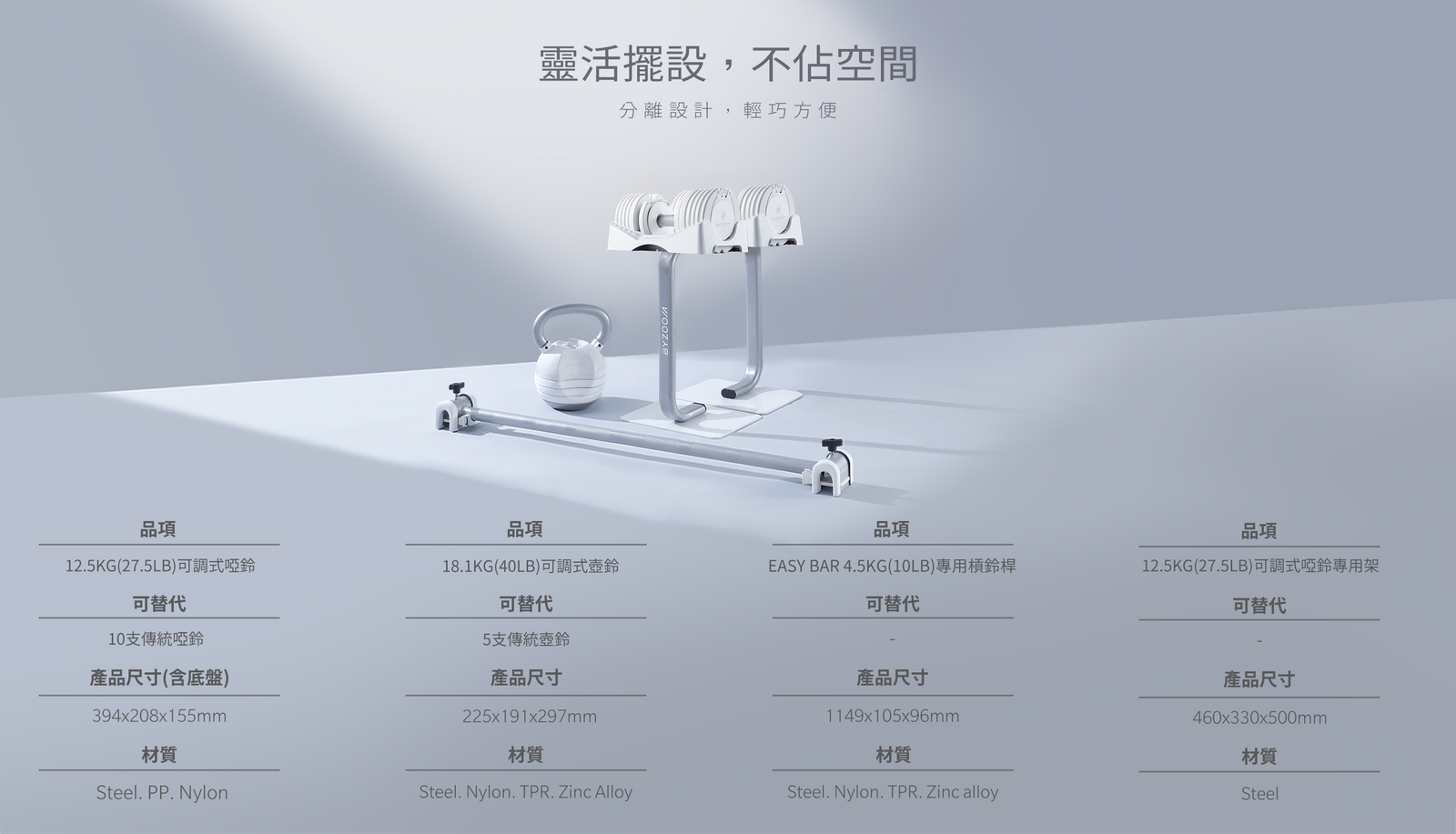 • 3 種可調式重量器材一次滿足訓練所需,十段重量秒速調整,居家健身新未來